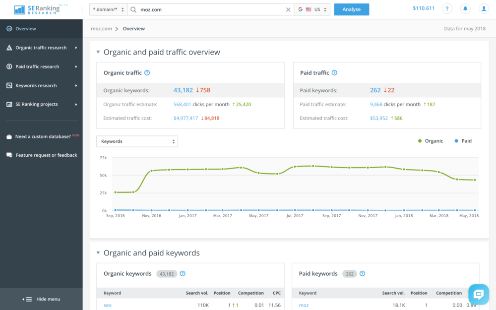 - Research your competitors. Discover their keywords and ads for paid and organic search. You may use competitor analysis tools for this purpose, for example, SE Ranking.